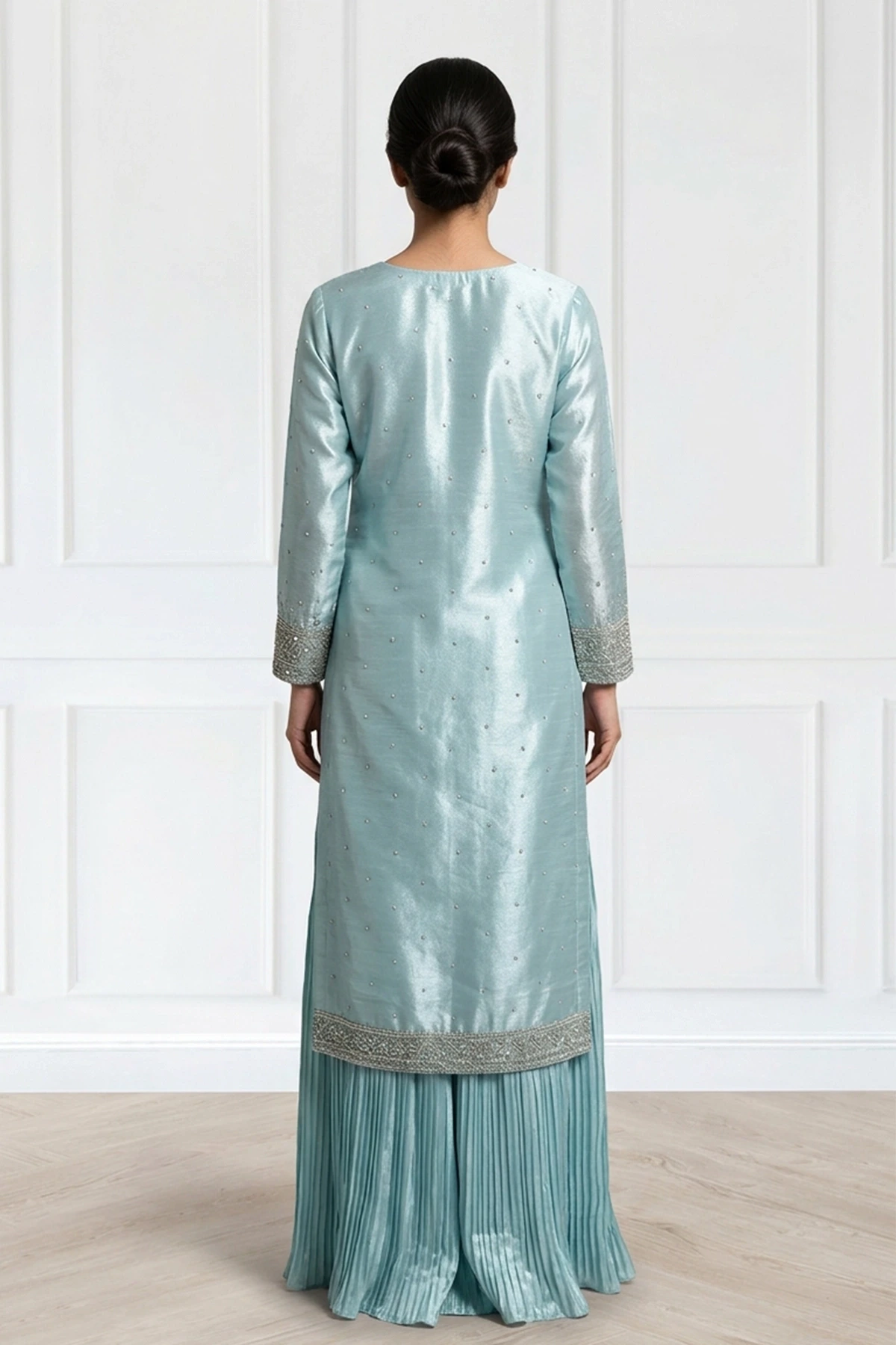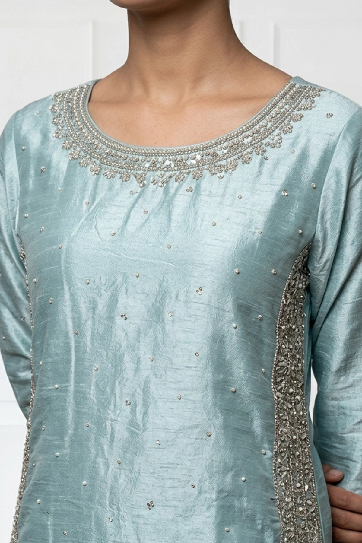 A straight shirt tailored from luxurious raw silk, featuring intricate dori work embroidery along the sides and neckline, creating a beautifully defined and elevated look.