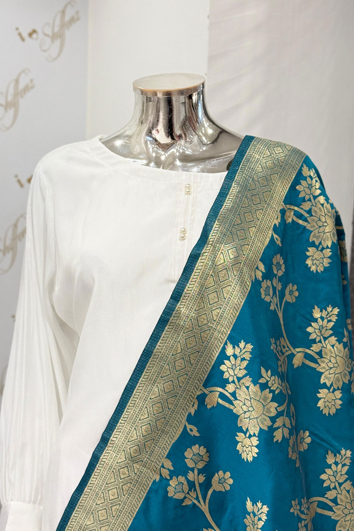 Add a touch of elegance to your wardrobe with this exquisite piece crafted from lightweight, sheer material that offers a delicate drape with banarsi printed patterns and feature a graceful width, perfect for layering. Adorned with intricate borders, they elevate any outfit for weddings or festive occasions.