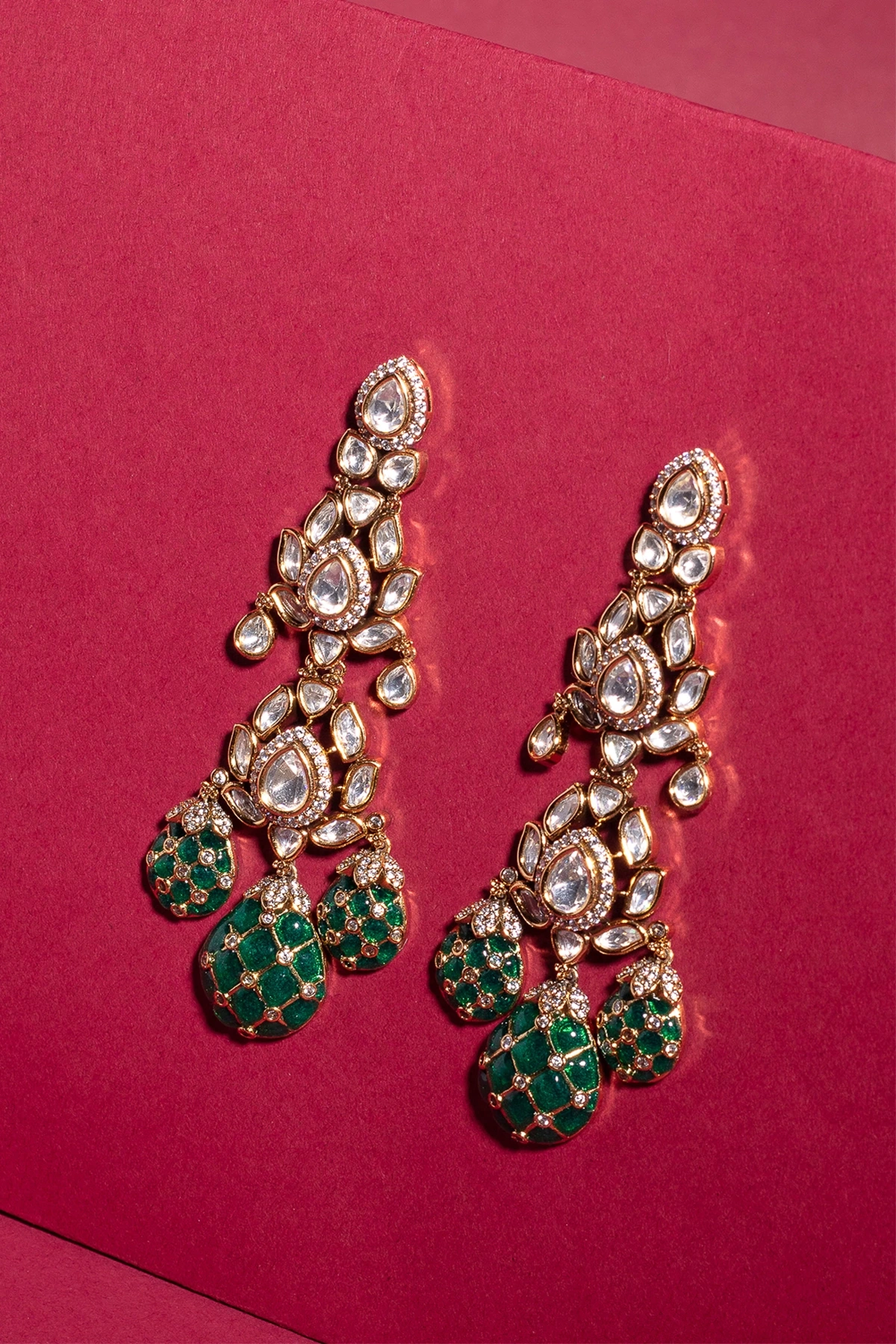 These handcrafted statement earrings blend regal charm with modern finesse. The upper section features a cascading arrangement of clear, marquise‑cut and teardrop crystals set in a warm gold finish, creating a luminous, high‑shine sparkle. The design flows into three intricately detailed emerald‑green teardrops, each adorned with delicate gold lattice work and micro‑crystal embellishments for added depth and richness.