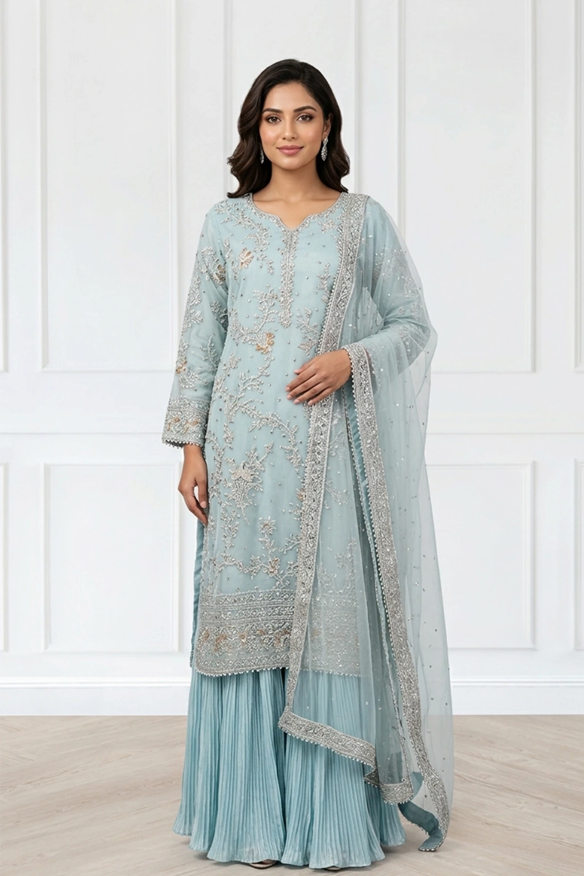 The ensemble is completed with a net embroidered dupatta, enhancing the look with lightness, elegance, and refined festive detailing.