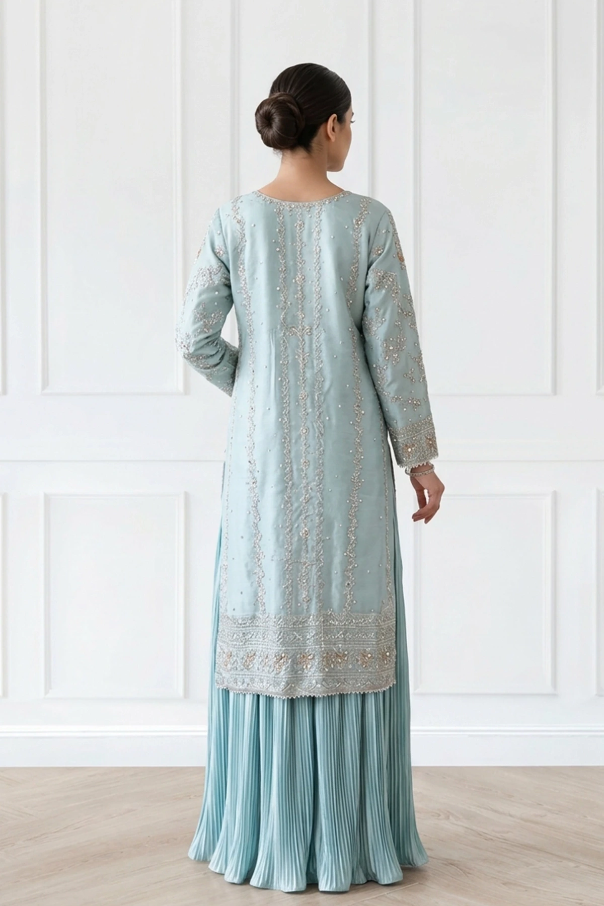 Paired with a crinkled lengha, adding graceful volume, movement, and a beautifully traditional silhouette.
