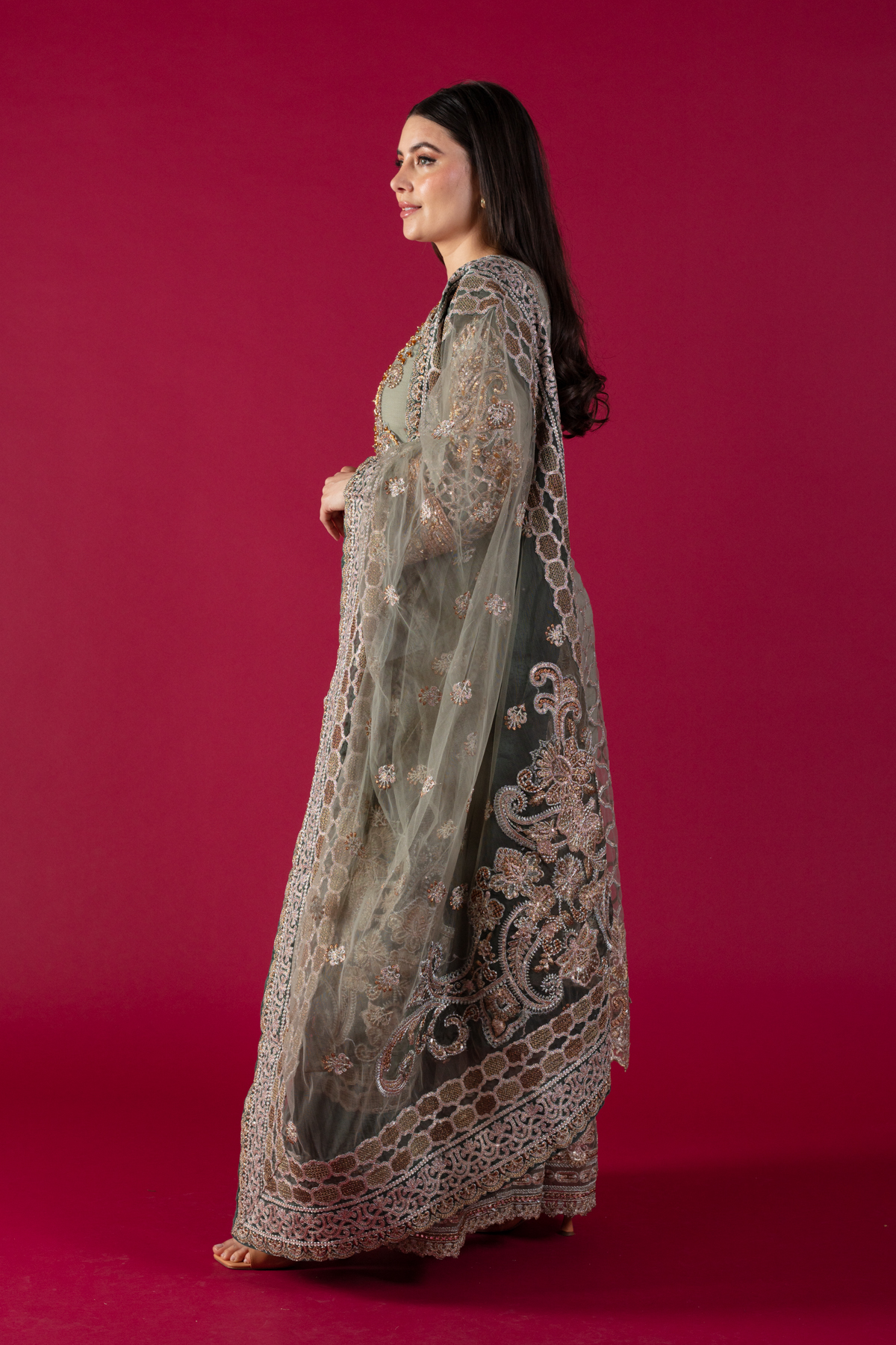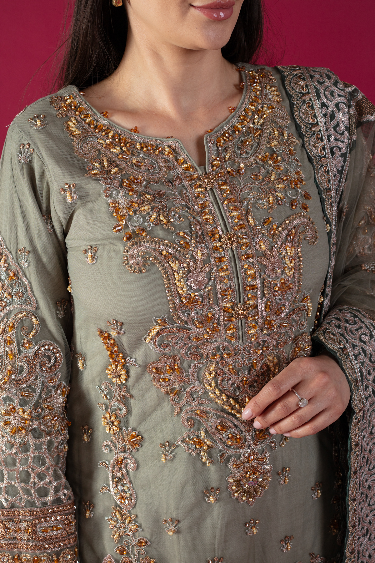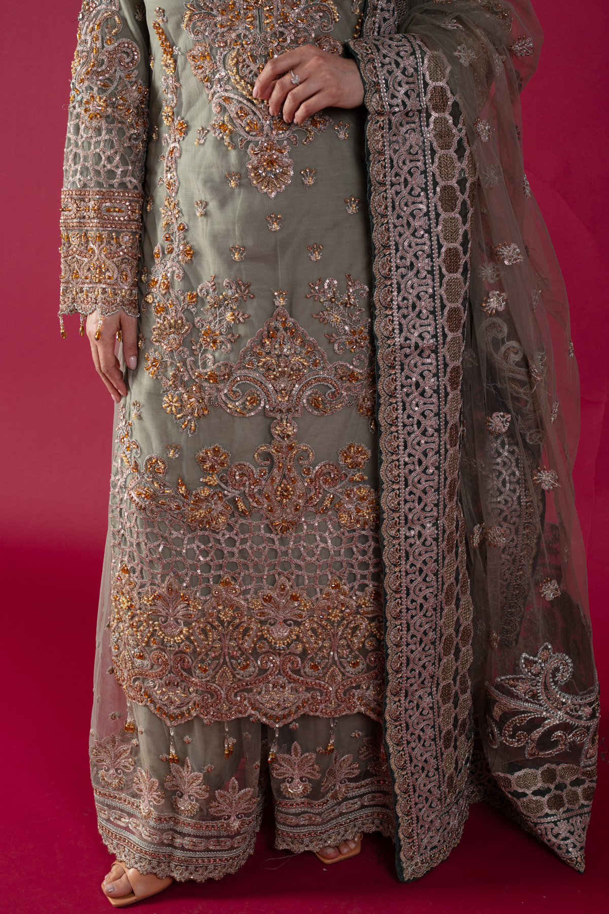 This beautiful 3-piece imrozia suit features a straight shirt with luxury thread work embroidery with bead work embellishments throughout, finished with full length embroidered sleeves. Paired with an embroidered net sharara and the look is finished with a net embroidered dupatta.