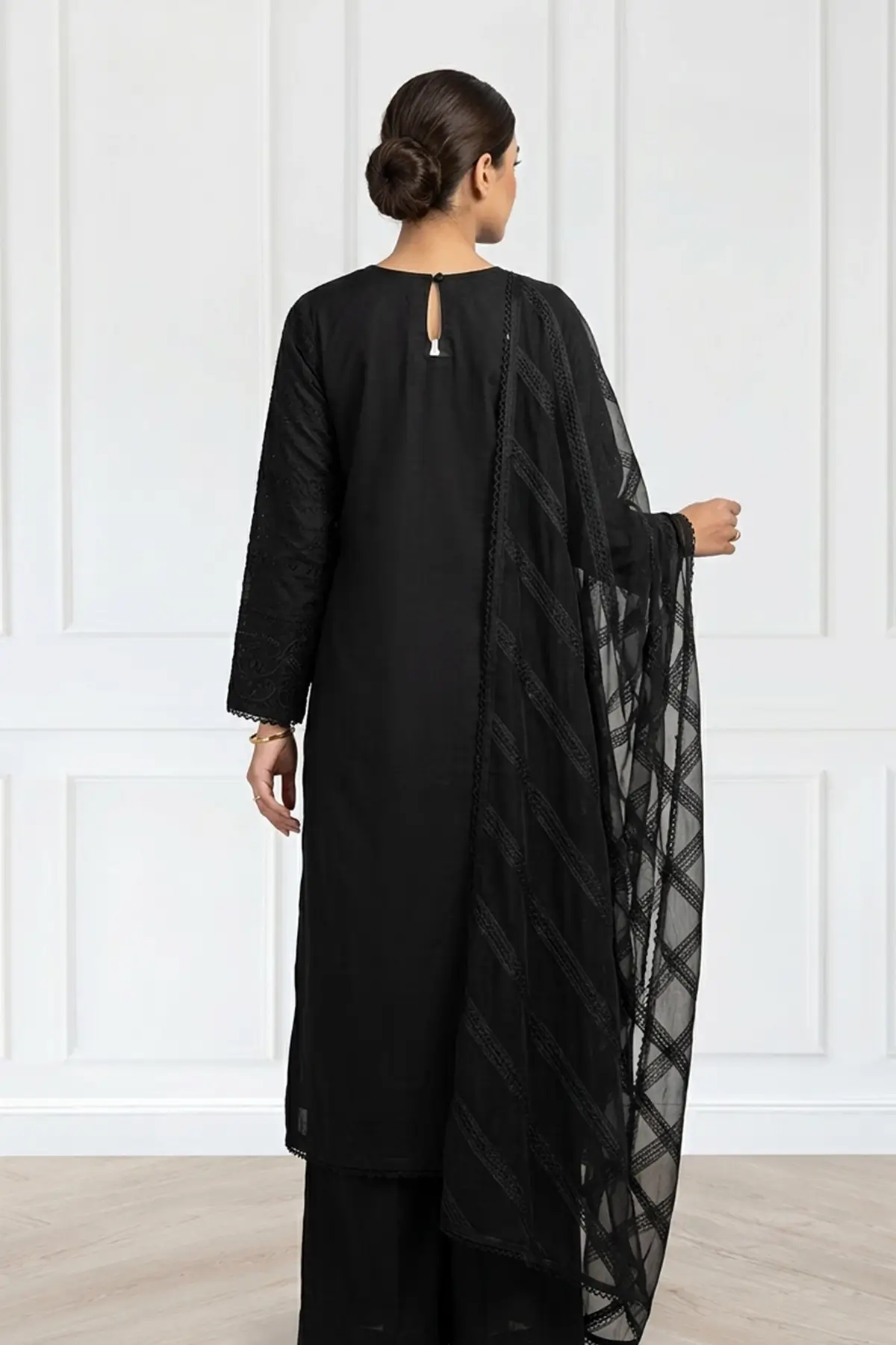 Paired with wide‑leg lawn trousers, offering comfort, flow, and a contemporary balance to the embroidered shirt.