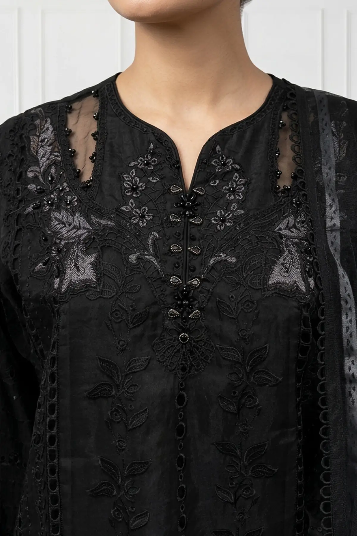 Designed with full‑length sleeves and embroidered cuffs, adding depth, texture, and a polished, elegant silhouette.