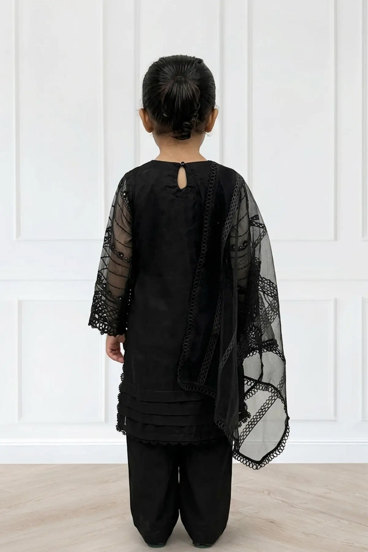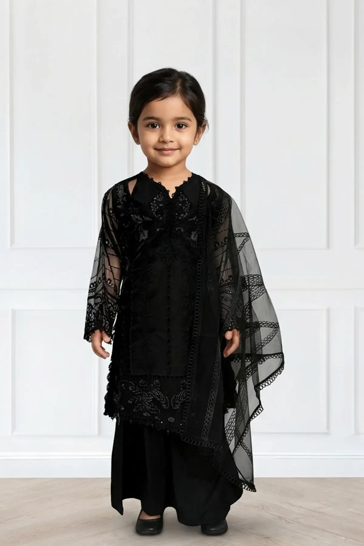 Paired with wide‑leg lawn trousers for effortless movement and a breezy silhouette, the outfit is beautifully completed with a net embroidered dupatta, adding a soft, delicate finishing touch. Thoughtfully crafted to mirror the adult version, this ensemble creates a coordinated, picture‑perfect mother‑and‑daughter Eid look that feels special, memorable, and beautifully refined.