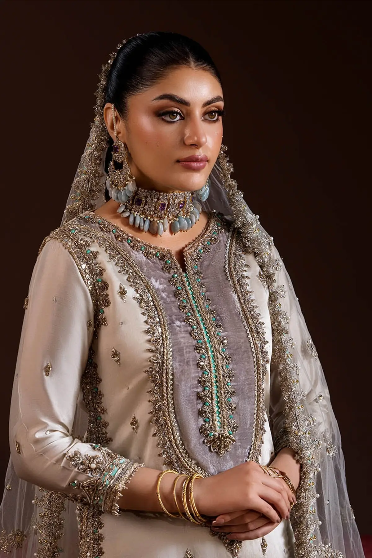 The ensemble is completed with an embroidered net dupatta, adding lightness, texture, and a beautifully delicate finishing layer.