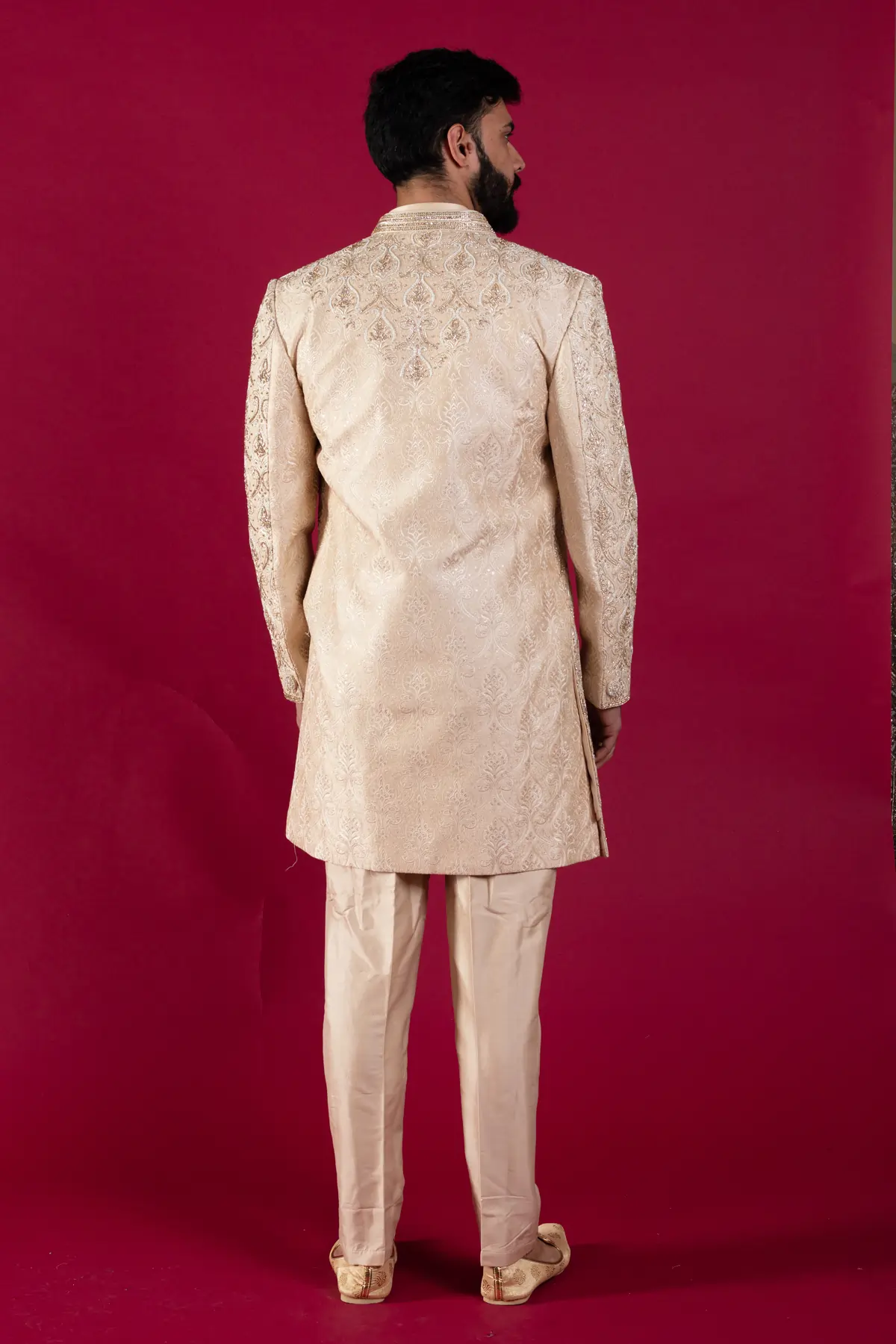 Traditional jacket style sherwani with embroidered thread work and embellishments with antique work on the raw silk fabric, also features an inner kurta with detailed button embellishment along the middle. Paired with straight leg raw silk trousers. The ensemble brings to life, a harmonious blend of tradition and modernity.