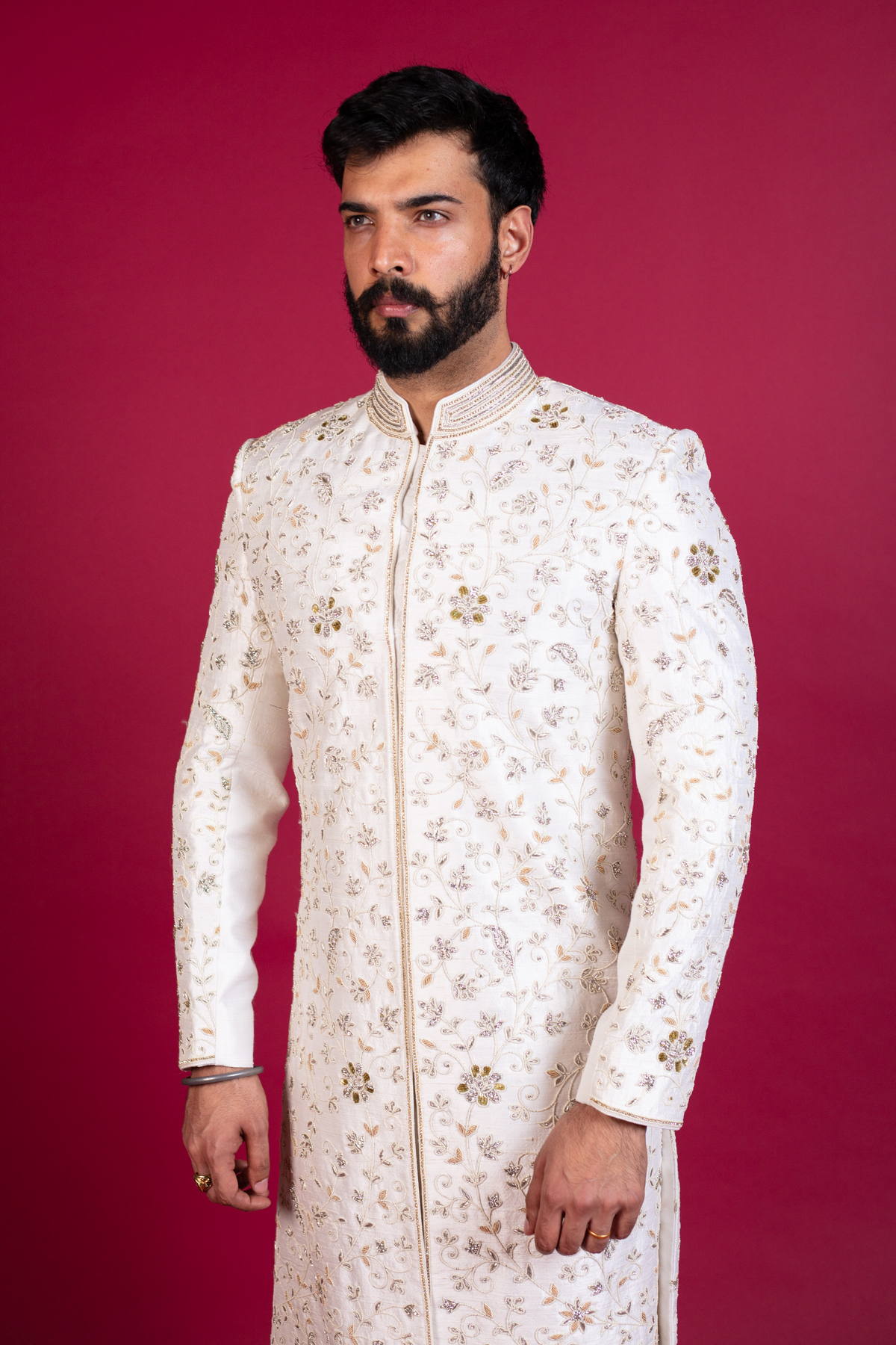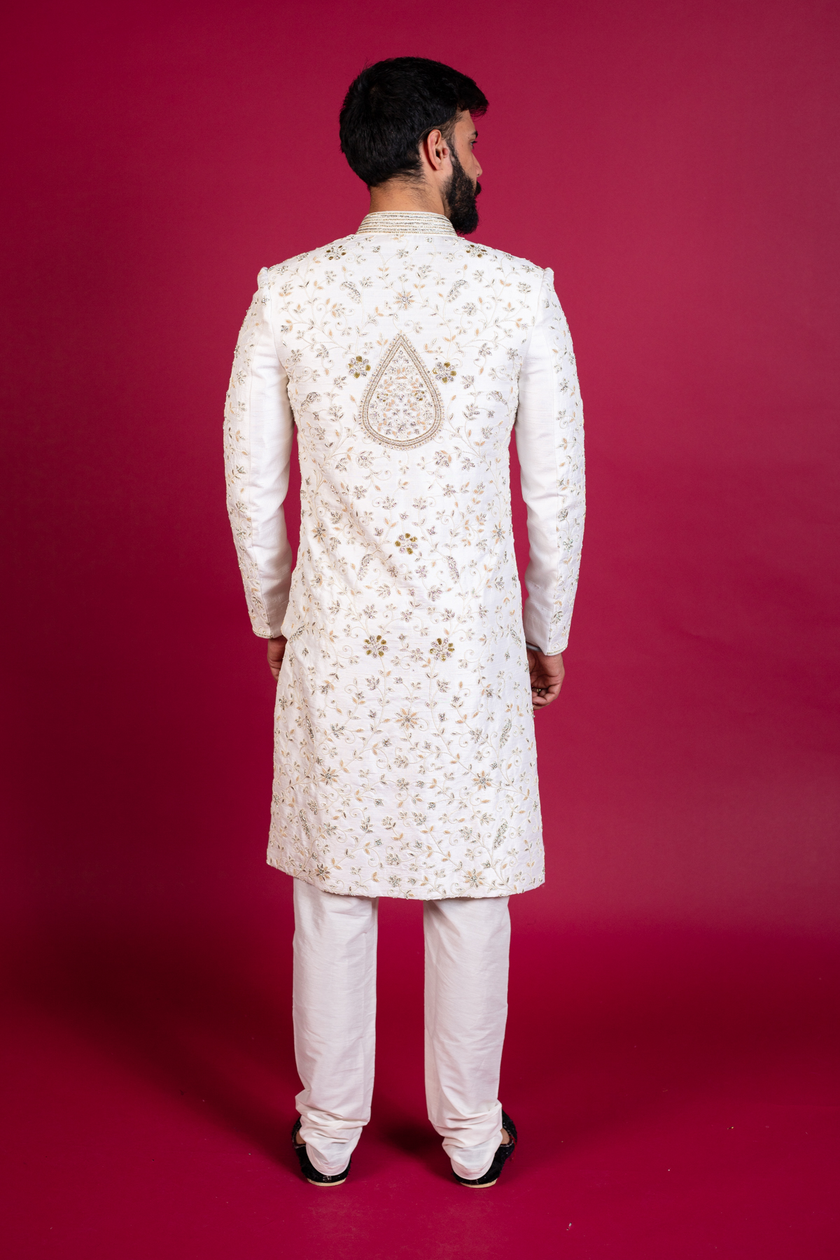This beautiful men's sherwani features a long coat all closed up to the collar and below the knee lengthwise. It is designed with beautiful thread-work embroidered detailing all over the front and full length sleeves with silver shiny scattered diamanté's. It's finished with churidaar trousers.