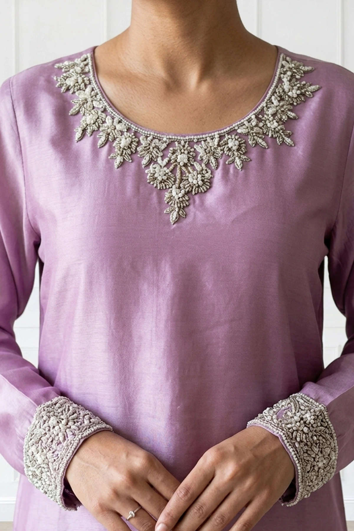 This beautiful 3 piece ensemble features a straight ombre shirt with delicate embroidery concentrated around the neckline, creating a soft focal point that elevates the muted base with subtle shimmer. Fine embellishments along the cuffs and hem add a graceful finish, balancing simplicity with artisanal detail. Paired with a soft raw silk trousers. The look is finished with a chiffon ombre dupatta.