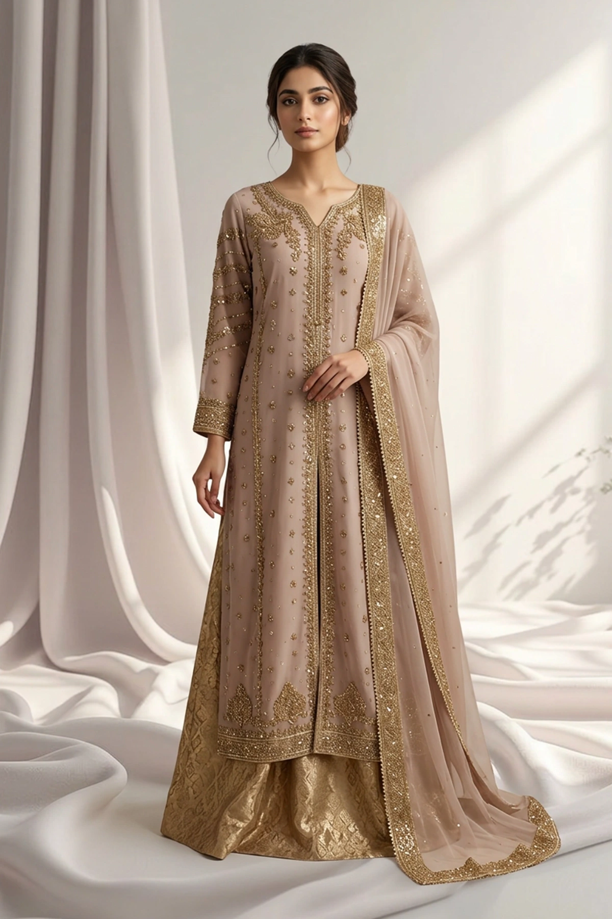 Chiffon Embroidered Dupatta The look is completed with a chiffon embroidered dupatta, adding graceful movement and a refined finishing touch.