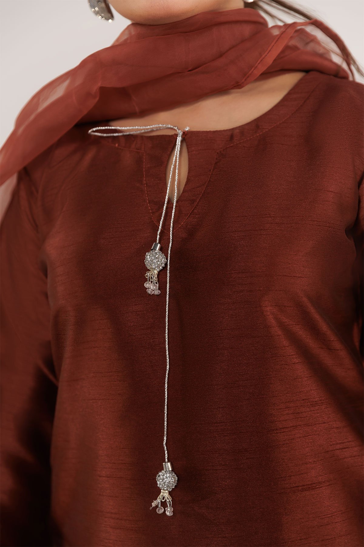 This beautiful Shiffonz 3-piece set is designed for effortless elegance, featuring a flowy straight-cut silhouette in rich silk. The kameez has delicate tassel embellishment along the neckline, finished with full length plain sleeves. Paired with a classic silk shalwar for comfort and a lightweight organza dupatta. Easy to wear and perfect for Eid.