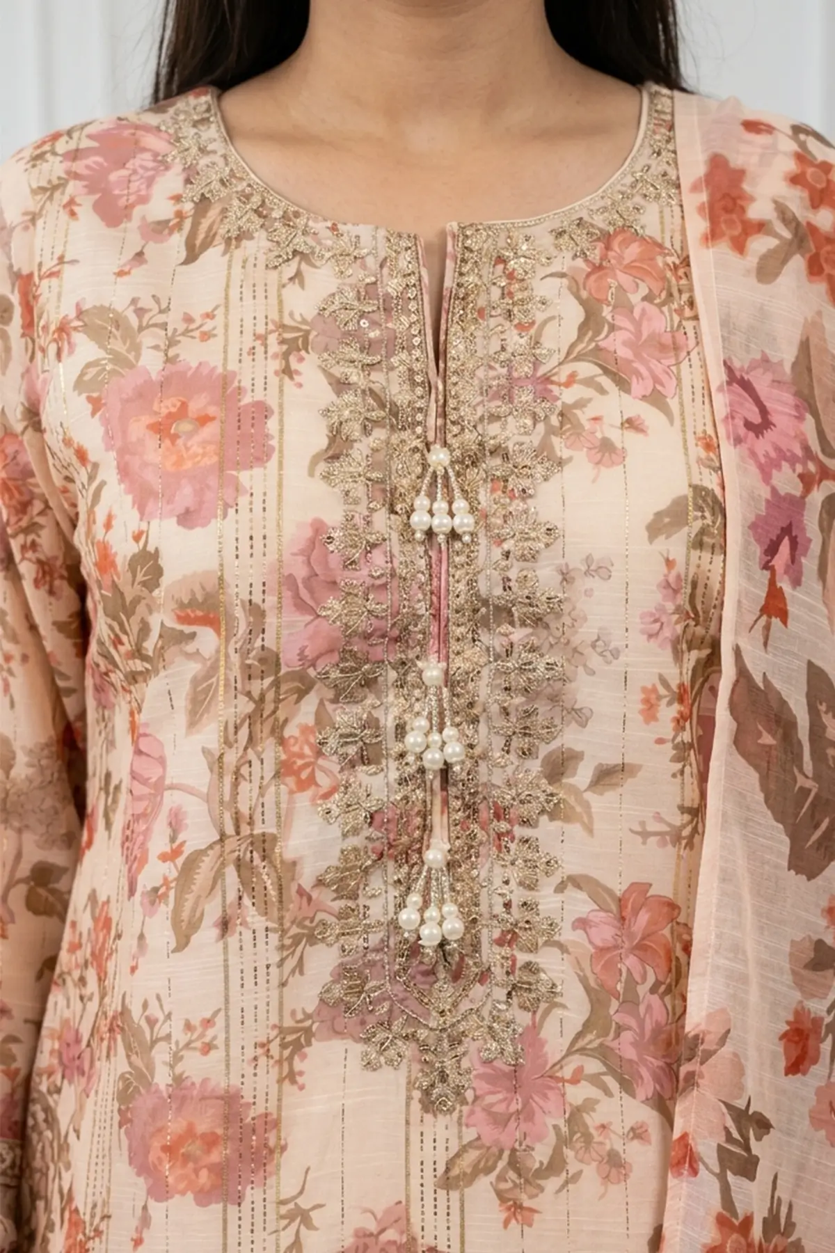 The ensemble is completed with a cotton silk printed dupatta, adding softness, colour, and a graceful finishing touch.