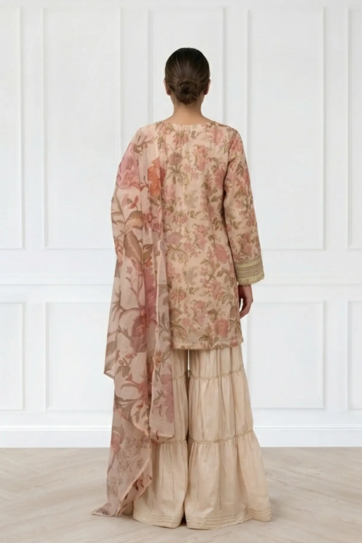 Paired with a beautifully layered gharara, featuring subtle textured detailing at each layer for added dimension, movement, and charm.