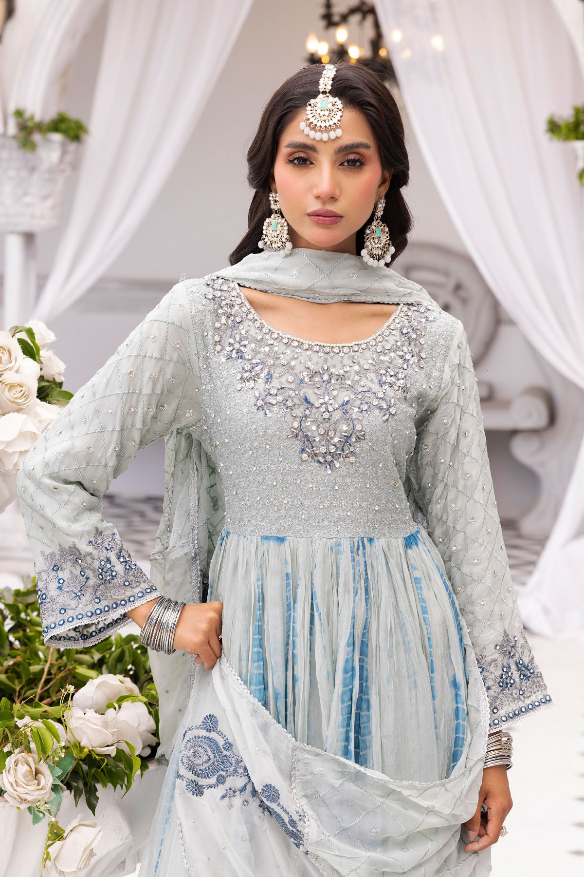 This beautiful 3 piece chiffon suit features a long maxi dress with luxury thread work embroidered front with bead embellishment along with a tie dye textured bottom half, finished with full length embroidered sleeves. Paired with straight leg crepe trousers and the look is finished with a chiffon dupatta.